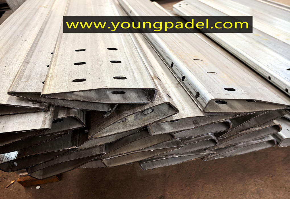 Grille métallique moulée monobloc, intégrée. Esthétique plus attrayante et sécurité accrue pour les joueurs de padel.